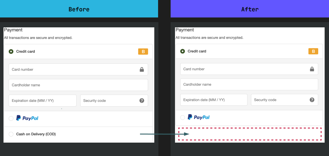 * **Left Side (Before):** All payment methods, including *Cash on Delivery*, are visible.